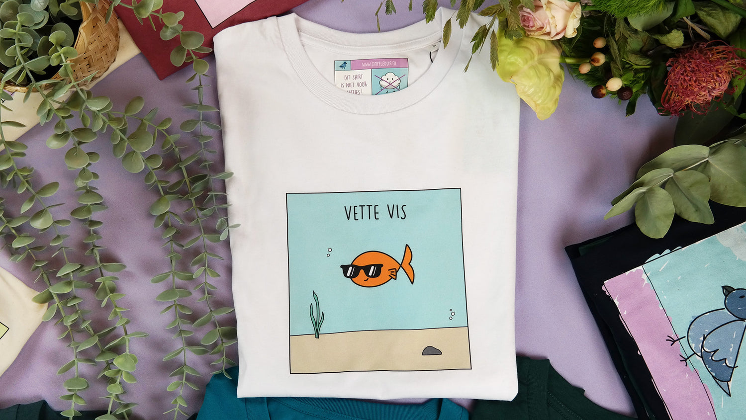 Ben jij de vetste vis van de bokaal? Dan is dit ontwerp op jouw lijf geschreven! Zwem lustig rond in je bokaal of vijver en maak de blits met je Vette Vis kleding!