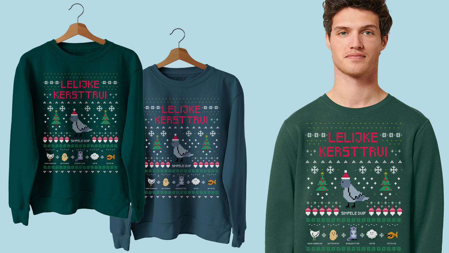 Deze trui identificeert zich als "lelijk" en is perfect voor de feestdagen. Breng de koude winterdagen door in deze heerlijke warme sweater van biologisch katoen én in het gezelschap van de Simpele Duif en zijn vriendjes!